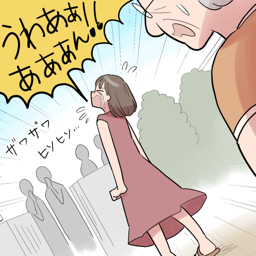 嫁いびりの噂が義祖母の耳に入ったので、案の定怒鳴られたのですがそれは想定内。私はわざわざ外に飛び出すと、近所中に響き渡るほどの声で大泣きしました。すると驚いて何人かの近所の人達が集まってきました。