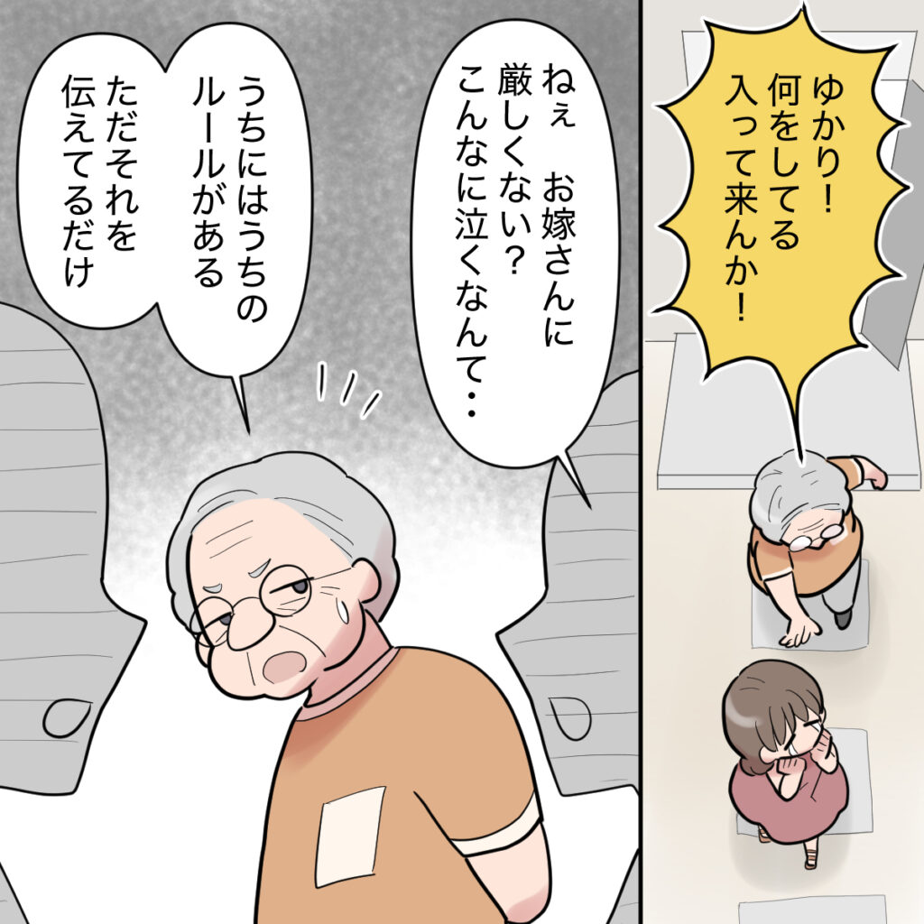 追いかけてきた義祖母が慌てて「ゆかり!何をしてる入って来んか!」と怒りましたが私は動きません。様子を見に来た近所の人たちが「ねぇお嫁さんに厳しくない?こんなに泣くなんて・・・」と庇って言ってくれると、義祖母は「うちにはうちのルールがある。ただそれを伝えてるだけ。」と言い返しました。でもその顔には焦りが見えます。