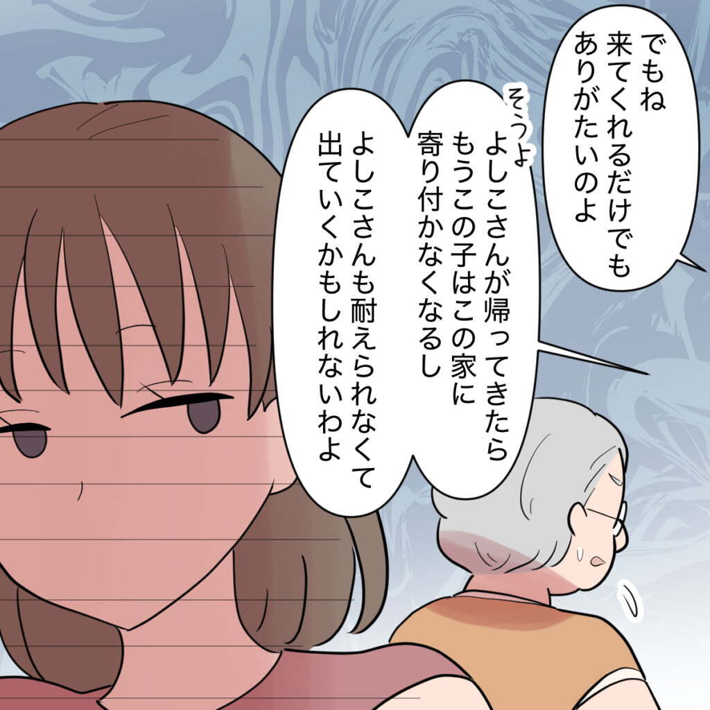 近所の人は引きませんでした。「でもね、来てくれるだけでもありがたいのよ。」「そうよ、よしこさんが帰ってきたらもうこの子はこの家に寄りつかなくなるし、よしこさんも耐えられなくて出ていくかもしれないわよ。」と口々に擁護してくれたのです。