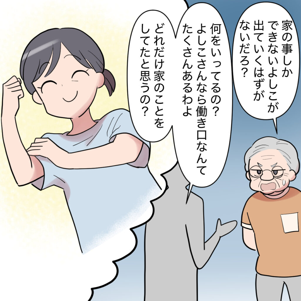 「家の事しかできないよしこが出ていくはずがないだろ?」義祖母はますます焦った顔で反論しましたが、「何をいってるの?よしこさんなら働き口なんてたくさんあるわよ。どれだけ家のことをしてたと思うの?」とハッキリ言われてしまいました。ご近所さんは義母のことをよく分かっていたようです。