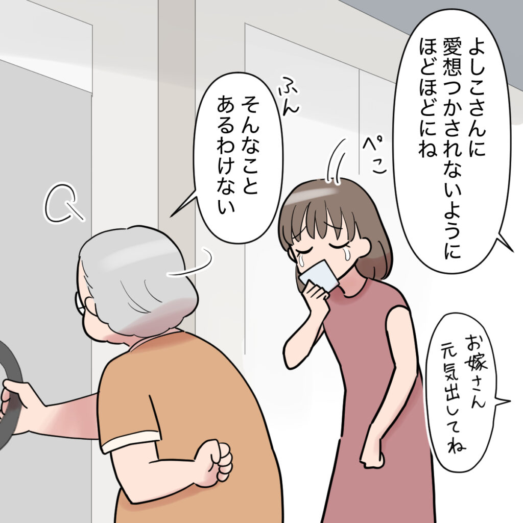 「よしこさんに愛想つかされないように、ほどほどにね。」「お嫁さん、元気出してね。」などと言われながら、義祖母は「ふん、そんあことあるわけない」と言いつつバツが悪そうに家に入っていきました。