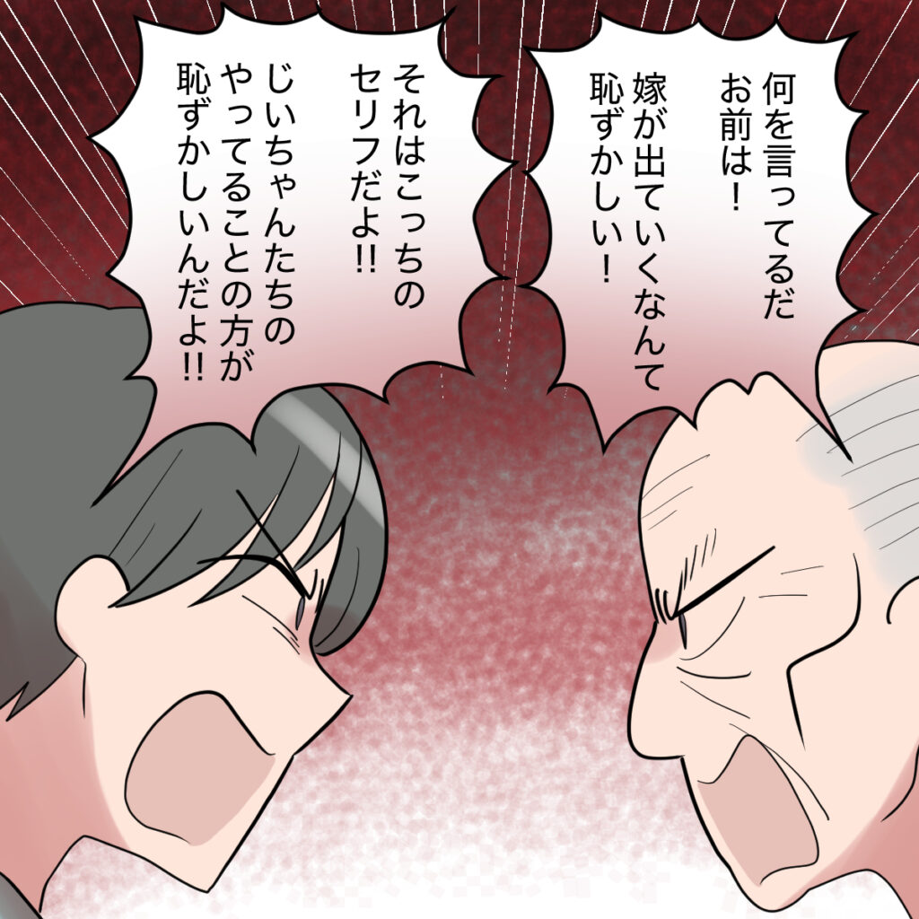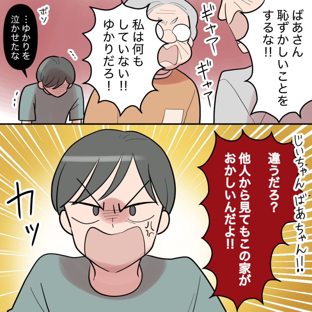 近所の人に嫁いびりのレッテルを貼られた義祖母に、「ばあさん恥ずかしいことをするな!!」と世間体を気にする義祖父が怒鳴りました。義祖母も「私は何もしていない!ゆかりだろ!」と反論し、言い合いが始まりました。私が泣かされたことで、ともやも怒り心頭。とうとう2人相手に怒鳴り始めました。「じいちゃんばあちゃん、違うだろ?他人から見てもこの家がおかしいんだよ!!」