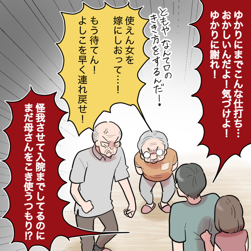 「ゆかりにまでこんな仕打ち・・・おかしいんだよ!気づけよ!ゆかりに謝れ!」すごい剣幕でともやはまくしたてました。突然ともやが口答えをしたので義祖父母はそれに対しても怒り出しました。「使えん女を嫁にしおって!もう待てん!よしこを早く連れ戻せ!」と叫ぶと、「怪我させて入院までしてるのにまだ母さんをこき使うつもり!?」ともやの怒りは収まりません。