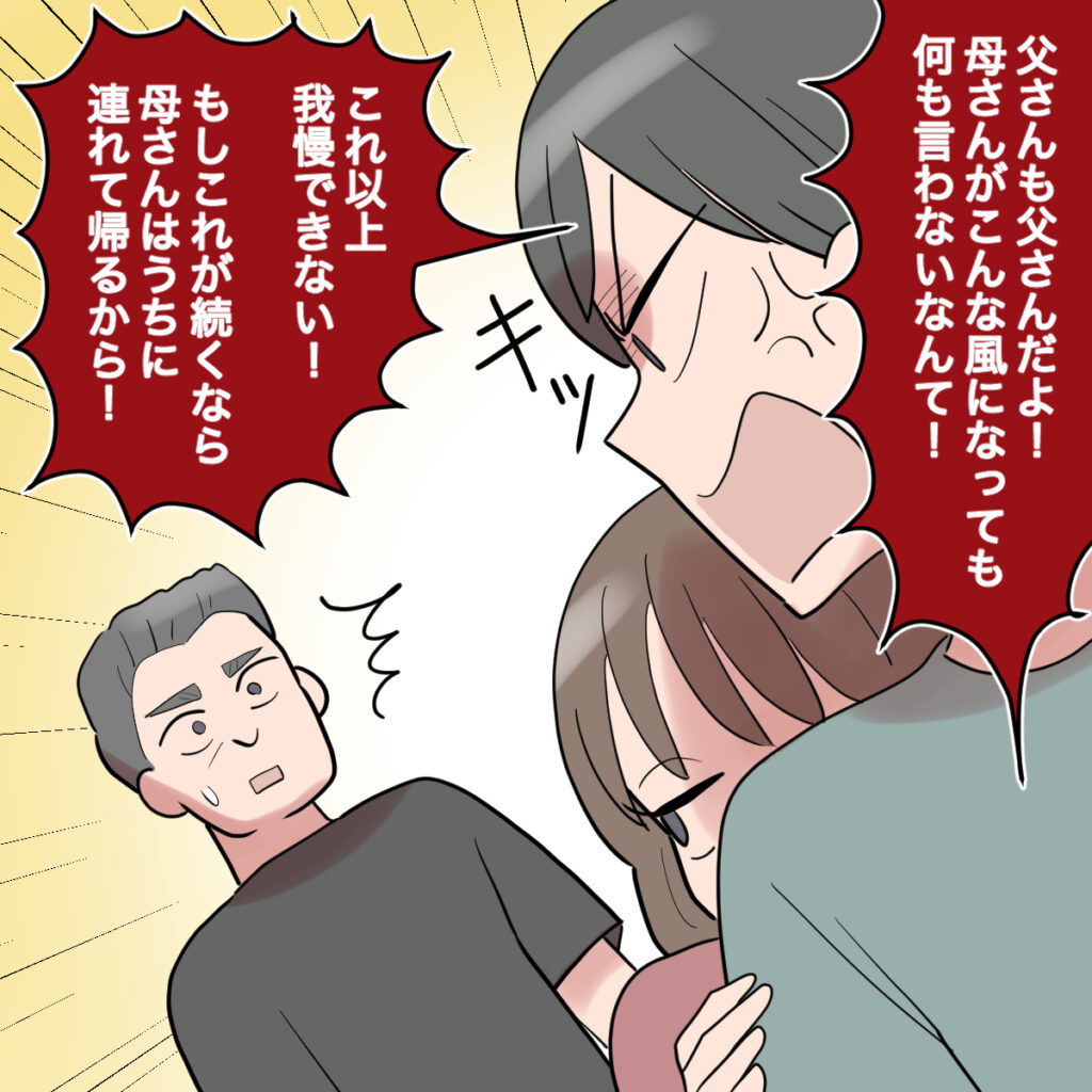 ともやの怒りは義父にも及びました。「父さんも父さんだよ!母さんがこんな風になっても何も言わないなんて!これ以上我慢できない!もしこれが続くなら母さんはうちに連れて帰るから!」突然息子からズバリ言われた義父は驚いた顔をして聞いていましたが、図星過ぎて何も言えないようです。私は泣いたふりをしながらともやの背中に隠れてみんなの様子をうかがっていました。