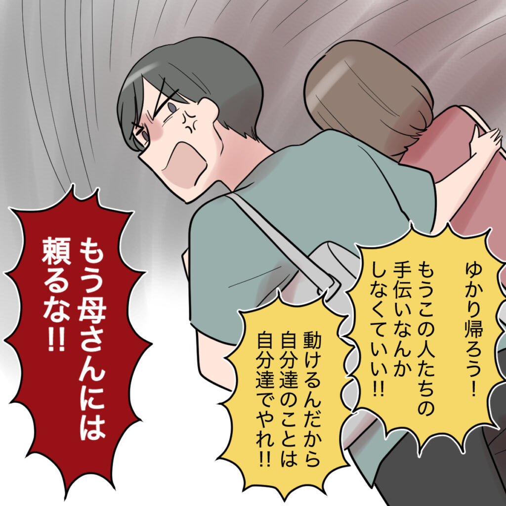 ともやはさっさと荷物をまとめると、「ゆかり帰ろう!もうこの人たちの手伝いなんかしなくていい!動けるんだから自分達のことは自分達でやれ!!」と言って、私の庇うようにして「もう母さんには頼るな!!」という捨て台詞と共に義実家を出ました。。