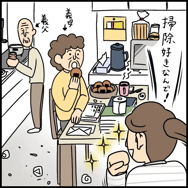 義母が遠慮するかもしれないと思った私は「掃除好きなんで!」と明るく元気いっぱいに言いました。義母がおせんべいを食べているテーブルの上はモノで埋めつくされ、なぜかトイレットペーパーまで置いてあります。これは片付け甲斐がありそうです。