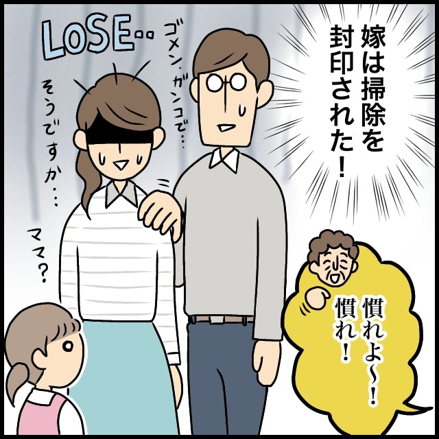 「慣れよ~!慣れ!」と笑い飛ばす義母にはこれ以上何を言っても聞く耳を持ってくれそうにありません。「そうですか・・」と力なく返し呆然と立ち尽くす私に夫が「ゴメン、ガンコで・・」と申し訳なさそうに言いました。掃除を封印された私はこの散らかり放題の家でやっていけるのか・・一気に不安になりました。