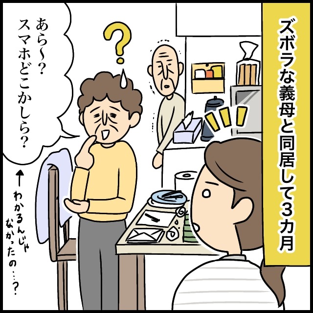 汚部屋での同居生活開始から3ヶ月が経過。ズボラな義母は以前から家の中でよくモノをなくしていましたが、嫁はこの3ヶ月で義母の探し物を見つけるのが得意になっていました。何がどこにあるかわからなくなるから勝手に触らないでと言っていた義母ですが、やはりモノが多すぎる上に散らかっているので自分でも把握できなくなっていますね。1日のうちに何度も家の中でモノが行方不明になるなんて不便で仕方ないと思うのですが、それでも義母は片付けようという気持ちにはならないようですね。