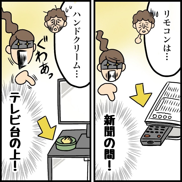 その後、私は義母の探し物を見つけるのがどんどん得意になっていきました。「リモコンは・・」と義母が言いかけると新聞の間にリモコンを見つけ、「ハンドクリーム・・」と呟く義母の声を聞けばすぐにテレビ台の上に置いてあるハンドクリームを見つけました。