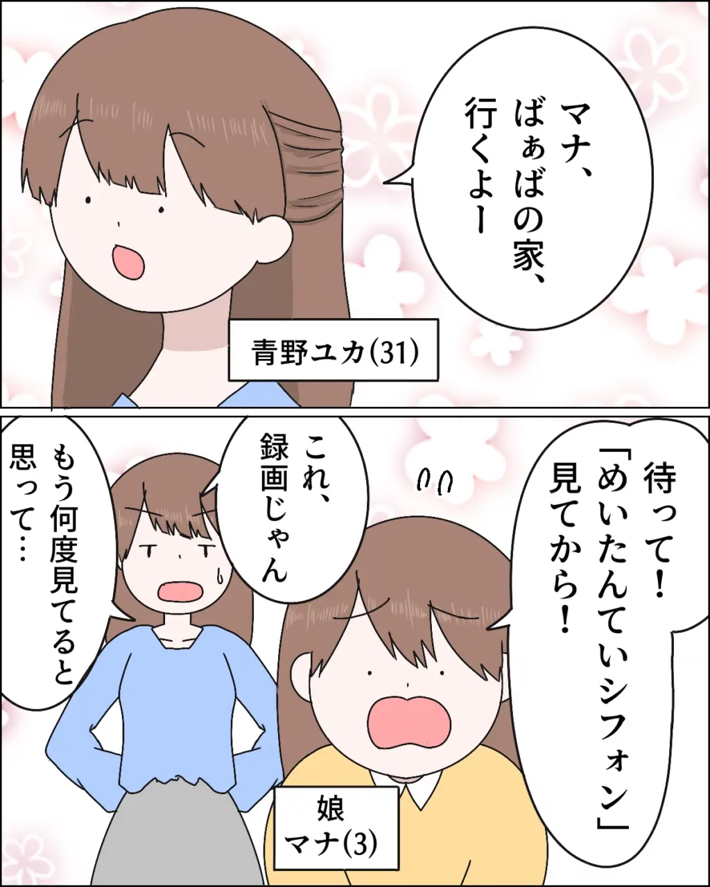 義母の家に遊びに行くことになってるこの日。出発時間になっても娘マナは、大好きなアニメ「名探偵シフォン」を見てからと行くと言ってテレビの前から離れません。義実家に持って行くお菓子も用意したし、昼前には着きたくて準備万端なのに、録画で何度も見ているアニメをいったん再生してしまうともう何を言ってもムダなのは私にもわかっていました。仕方なくテレビの前に行った私は。