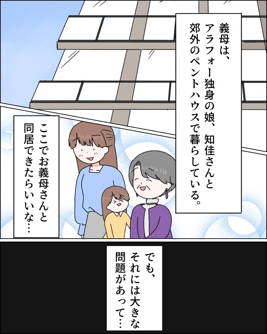 義実家は郊外の高級マンションの最上階。アラフォー独身の娘、知佳さんとこの豪華なペントハウスで暮らしています。そろそろマイホームが欲しいと思っている私は、遊びに来るたびにこんな素敵な家で義母と同居できたらどんなに素敵だろうと淡い夢を抱いていました。