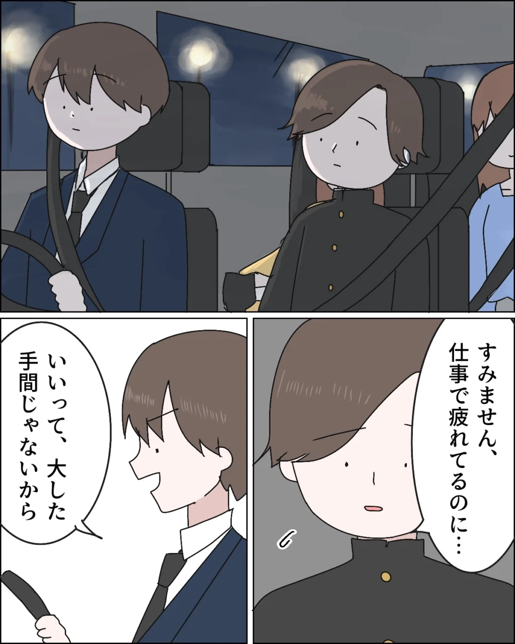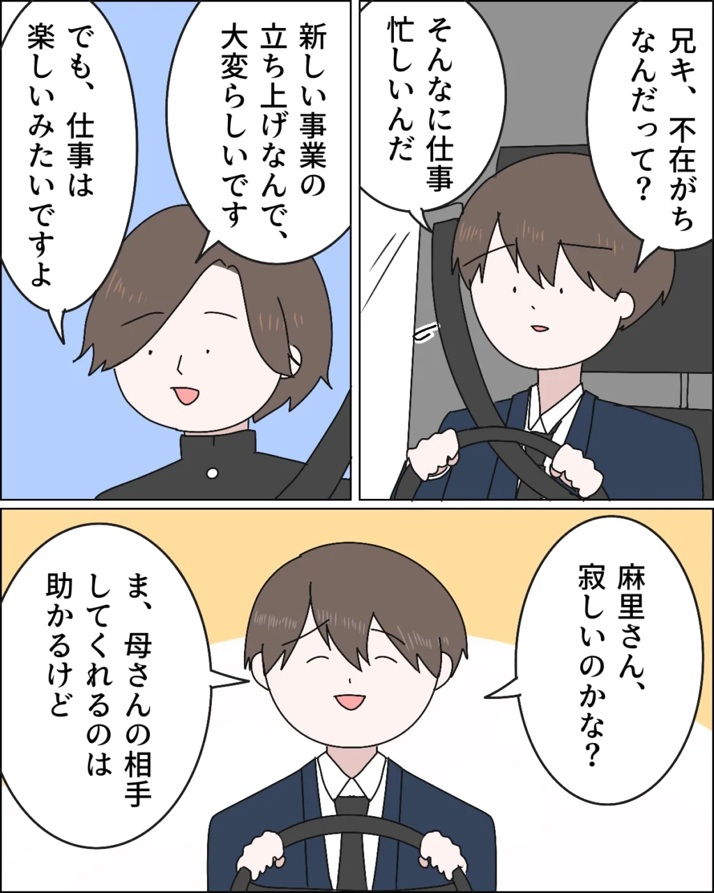帰り道の車内。「すみません、仕事で疲れてるのに・・」と申し訳なさそうにするユウトくんに「いいって、大した手間じゃないから」と康太が優しく言いました。