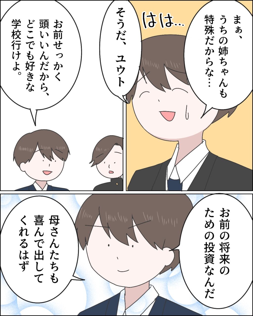 「まぁ、うちの姉ちゃんも特殊だからな・・」と苦笑いした康太は、「そうだ、ユウト」と切り出すと「お前せっかく頭いいんだから、どこでも好きな学校行けよ。お前の将来のための投資なんだ。母さんたちも喜んで出してくれるはず」とユウトくんの背中を押しました。