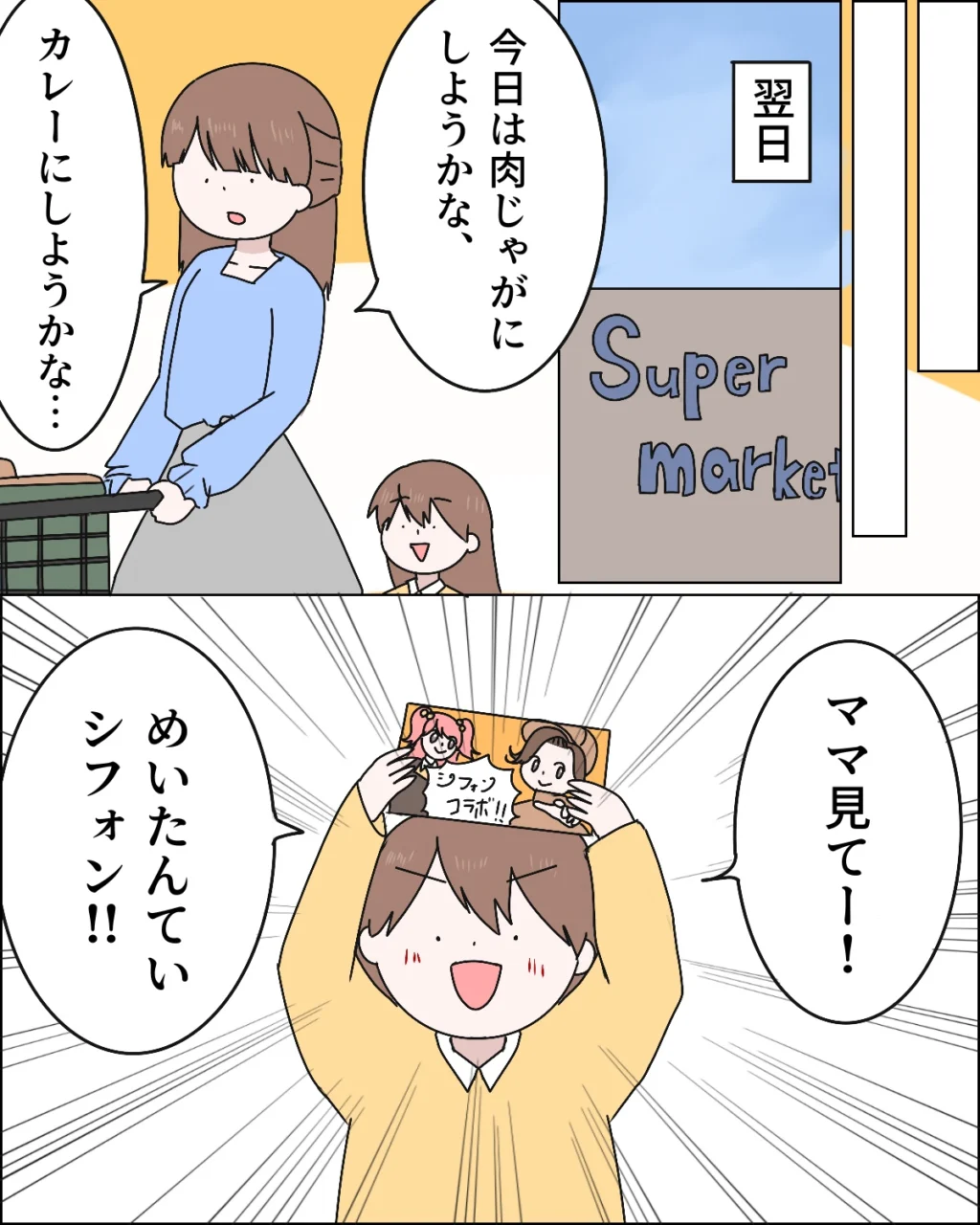 翌日、夕飯の買い出しのため、スーパーにやってきた私とマナ。肉じゃがにするか、それともカレーにするか・・・献立に悩んでいると、「ママ見てー! めいたんていシフォン!」とマナが嬉しそうに声を上げます。マナの手には、名探偵シフォンとコラボしたお菓子が握られていました。