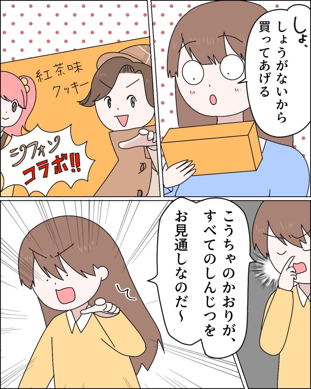 名探偵シフォンとのコラボ商品と聞いて、買わずにはいられない私。「しょ、しょうがないから買ってあげる」なんて言いながら、迷いなく商品を買い物カゴへ入れました。するとテンションが上がったマナが、「こうちゃのかおりが、すべてのしんじつをお見通しなのだ~」と名探偵シフォンの決め台詞を得意げに披露します。