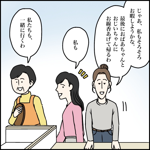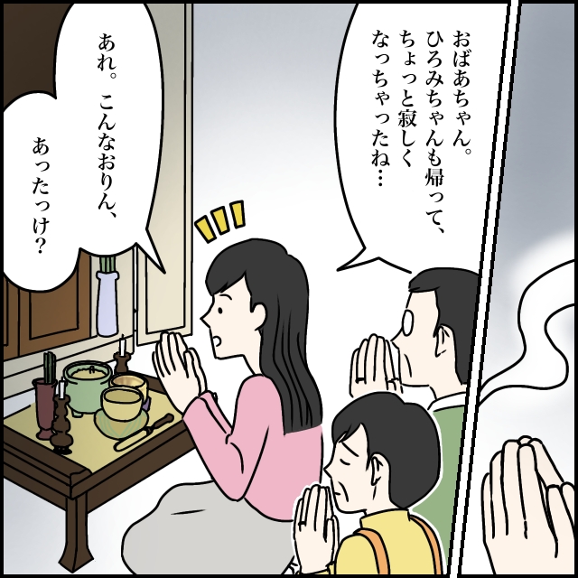 「じゃあ私もそろそろお暇しようかな、最後におばあちゃんとおじいちゃんにお線香あげて帰るわ」と立ち上がるひろみちゃん。せっかくだからみんなで行こうと、義母と義父が眠る仏間に向かいました。