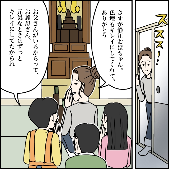 助っ人として来てくれたひろみさんが帰ると言うので、義母と義父にお線香をあげに仏間に向かった静江さんたち。ひろみさんは仏壇に手を合わせると、「さすが静江おばちゃん、仏壇もキレイにしてくれてありがとう」と言いました。「お義母さん、元気なときはずっとキレイにしてたからね」頑張らなくちゃ叱られちゃうと静江さんが笑いながら言うと、ひろみさんも優しく笑い返してくれました。