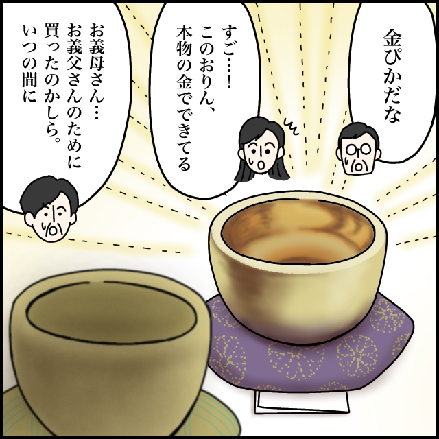 経机に目をやると、いつものおりんに加えて、金色に輝くおりんがありました。なんと、本物の金でできているみたいです。「お義母さん・・・お義父さんのために買ったのかしら、いつの間に」義母から何も聞いていなかった私たちは驚きました。