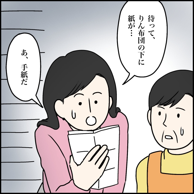 「待って、りん布団の下に紙が・・・」涼子がりん布団の下に挟まった紙を見つけました。どうやら義母が書いた手紙のようです。私たちはすぐに手紙を開き、中身を確認しました。