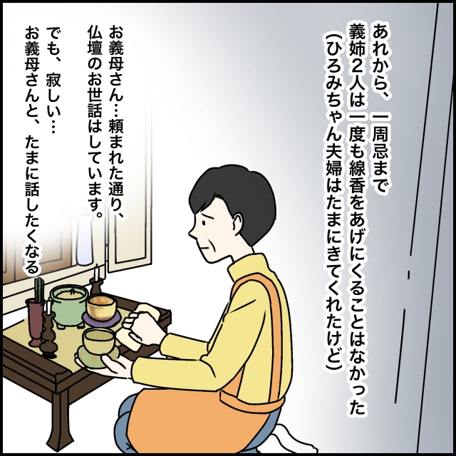 あれから一周忌まで、結局義姉たちは一度もお線香をあげにくることはありませんでした。ひろみちゃん夫婦は忙しい合間を縫ってきてくれたけど、やっぱりあの2人は義母の遺産にしか興味がなかったんだな・・・とつくづく呆れました。