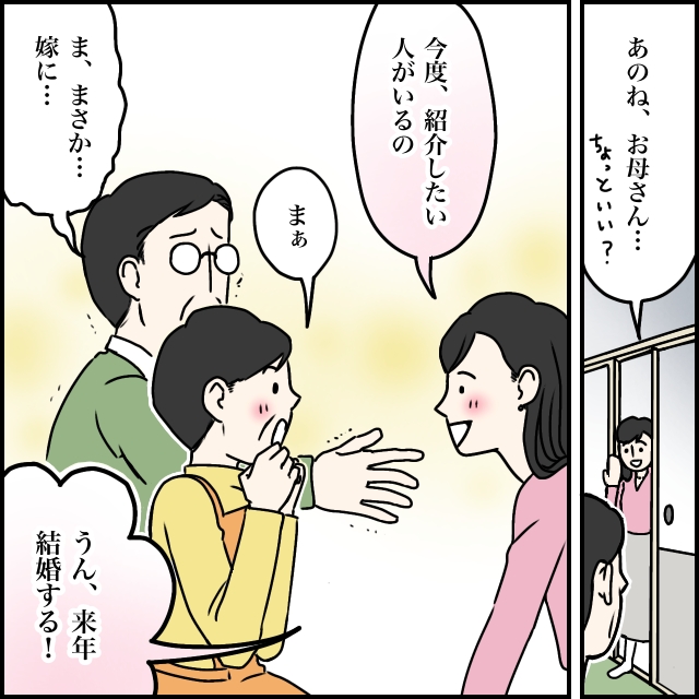 吉雄さんと2人で仏壇に手を合わせていると、涼子から「今度、紹介したい人がいるの」と嬉しい言葉が。突然の報告に喜ぶ私たち。吉雄さんは「ま、まさか嫁に・・・」と震えながら涼子に手を伸ばします。「うん、来年結婚する!」満面の笑みで報告する涼子。すっかり暗くなってしまった我が家に、義母が幸せを運んできてくれたのでしょうか。