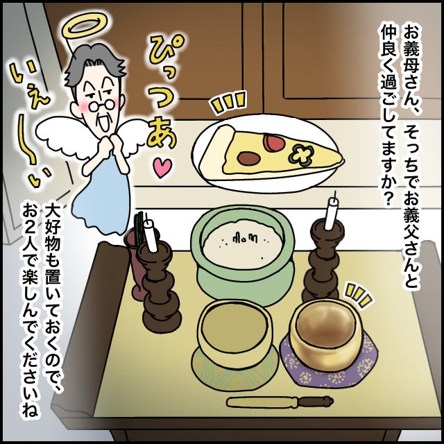 「お義母さん、そっちでお義父さんと仲良く過ごしてますか?大好物のピザも置いておくので、お2人で楽しんでくださいね」仏壇の前で手を合わせながら、天国の義母にそう話しかけると、お供え物のピザの横で天使の姿をした義母が喜んでいるような気がしました。