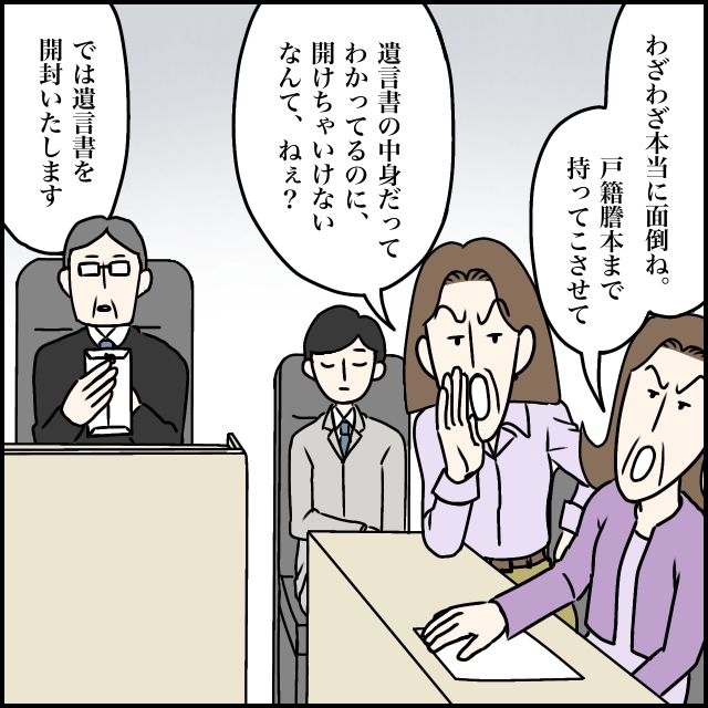 「わざわざ本当に面倒ね、戸籍謄本まで持ってこさせて」「遺言書の中身だってわかってるのに開けちゃいけないなんて、ねぇ?」ここでも小言を言う義姉たち。さっさと遺産を受け取って帰りたいという気持ちがこちらにまで伝わってきて呆れてしまいます。