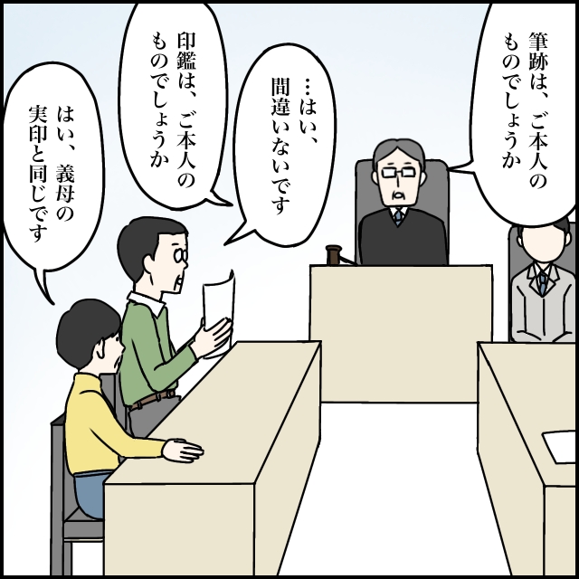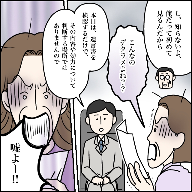 2枚目に記された内容を見て、「ちょっと、これどういうことなの!?」と吉雄さんに詰め寄る義姉たち。吉雄さんは「知らないよ俺だって初めて見るんだから」と言いました。吉美さんは、遺言書を握りしめ「こんなのデタラメよね?」と震えながら聞きます。裁判官が「本日は遺言書を検認するだけで、その内容や効力について判断する場所ではありませんので」と答えると、吉子さんは「噓よー!」と叫びました。