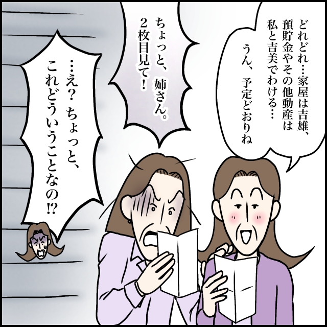 義姉たちに遺言書を渡すと、2人はウキウキした様子で内容を確認し始めました。「どれどれ・・・家屋は吉雄、預貯金やその他動産は私と吉美でわける・・・うん予定どおりね」満足そうな様子で読み上げる吉子さん。するとその横で「ちょっと姉さん、2枚目見て!」と吉美さんがひどく驚いた様子で言いました。