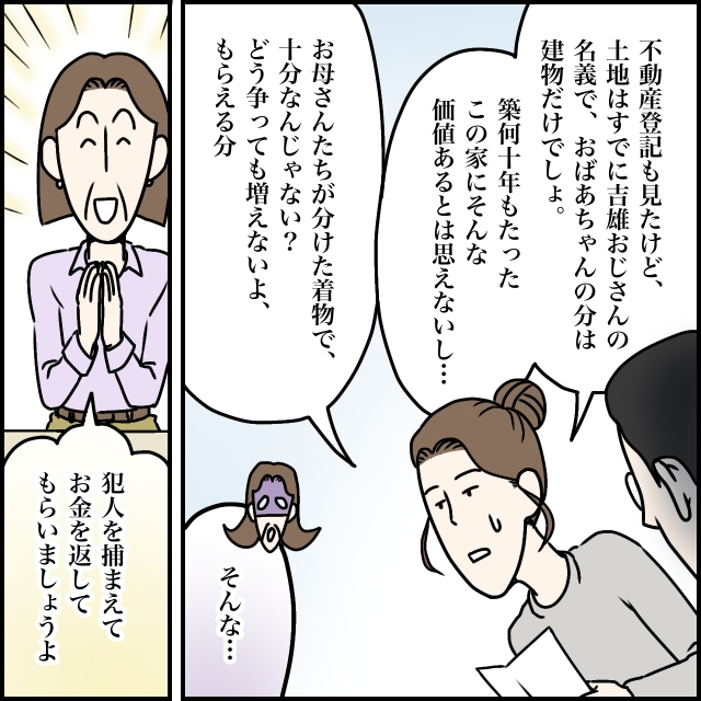 遺産の当てが外れて焦る義姉たち。吉子さんは娘のひろみさんに、自分たちの取り分を増やせないか聞きますが、どう争ってももらえる遺産は増えないという言葉にショックをうけます。すると吉美さんが、犯人を捕まえてお金を返してもらおうと提案しますが、犯人が捕まってもお金はほとんど帰ってこないと聞くと、魂が抜けたように元気を失い、仏壇に手を合わせることもなく帰っていきました。
