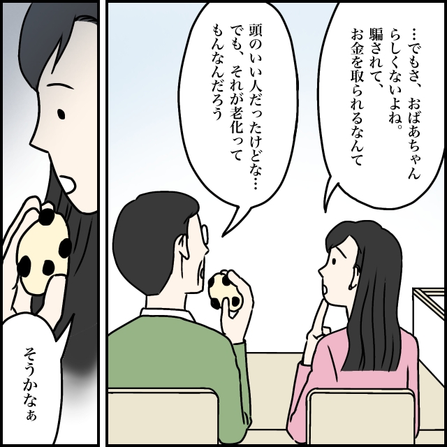 すると涼子が「でもさ、おばあちゃんらしくないよね、騙されてお金を盗られるなんて」と不思議そうに聞きます。「頭のいい人だったけどな・・・でもそれが老化ってもんなんだろう」と吉雄さんは言いますが、涼子は腑に落ちない様子。