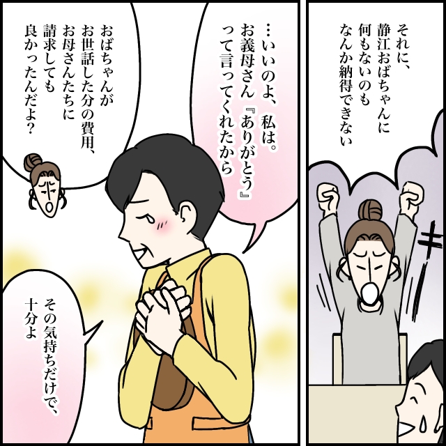 「それに、静江おばちゃんに何もないのも納得できない」キーッと不満そうに言うひろみちゃんに、「いいのよ、お義母さんがありがとうって言ってくれたから」と言いました。「おばちゃんがお世話した分の費用、お母さんたちに請求してもよかったんだよ?」とことん気遣ってくれるひろみちゃん。私は微笑みながら「その気持ちだけで十分よ」と言いました。