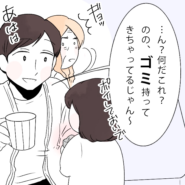 すると、「・・ん?何だこれ?のの、ゴミ持ってきちゃってるじゃん~。ポイしておいて」夫がののに笑いながらそう言うと、それを聞いていた義母がギクリ。