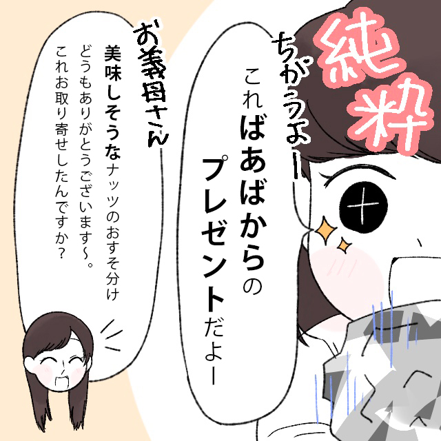 すると、「ちがうよー、これ『ばあばからのプレゼント』だよー」とののが無邪気に言い、「お義母さん、美味しそうなナッツのお裾分け、どうもありがとうございます~。これお取り寄せしたんですか?」と皮肉を込めつつ笑顔でそう言うと、