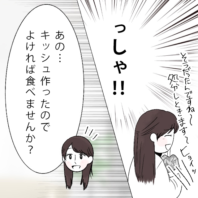その姿を見て、「っしゃ!!」と心の中でガッツポーズする私は、「そうだったんですね~。処分しておきます~」とさっさとナッツを処分。そして、「あの・・キッシュ作ったのでよければ食べませんか?」と言うと、