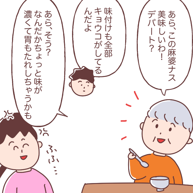 「味付けも全部キョウコがしてるんだよ」と夫が言ってくれると、すかさず義母は「あら、そう?なんだかちょっと味が濃くて胃もたれしちゃうかも」と言ってくるあたり、どうしても私の料理を褒めたくないようです。