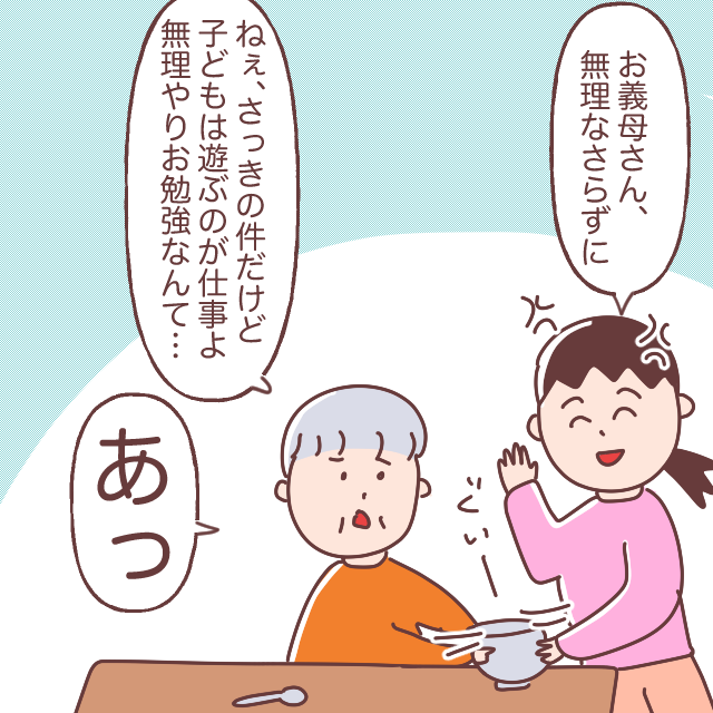 勝手なことを言いながらも食べる手は止めない義母。「ねぇ、さっきの件だけど子どもは遊ぶのが仕事よ。無理やりお勉強なんて・・・」とまたユイトの勉強のことを言い始めました。無理やりじゃないってば。