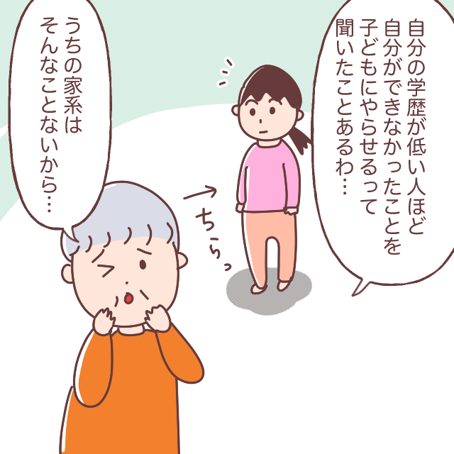 「自分の学歴が低い人ほど自分ができなかったことを子どもにやらせるって聞いたことあるわ・・・」私をチラ見しながら言いました。そして「うちの家系はそんなことないから・・・」と意味深に言葉を濁しました。何を言いたいか想像できますよ、お義母さん。