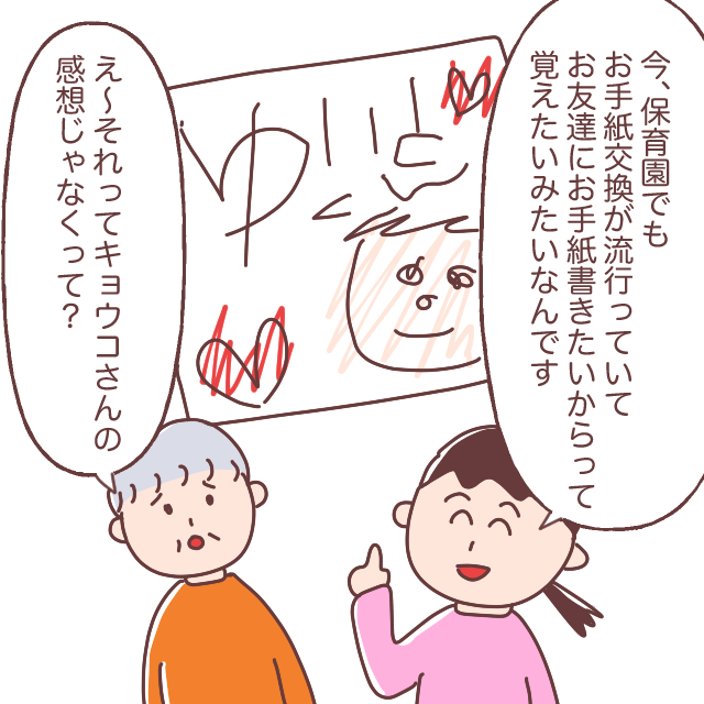 私はユイトがひらがなを覚えたきっかけを義母に伝えました。「今、保育園でもお手紙交換が流行っていて、お友達にお手紙書きたいからって覚えたいみたいなんです。」あくまでもユイトが覚えたい、と強調しました。それでも「え~それってキョウコさんの感想じゃなくって?」と不満顔の義母。