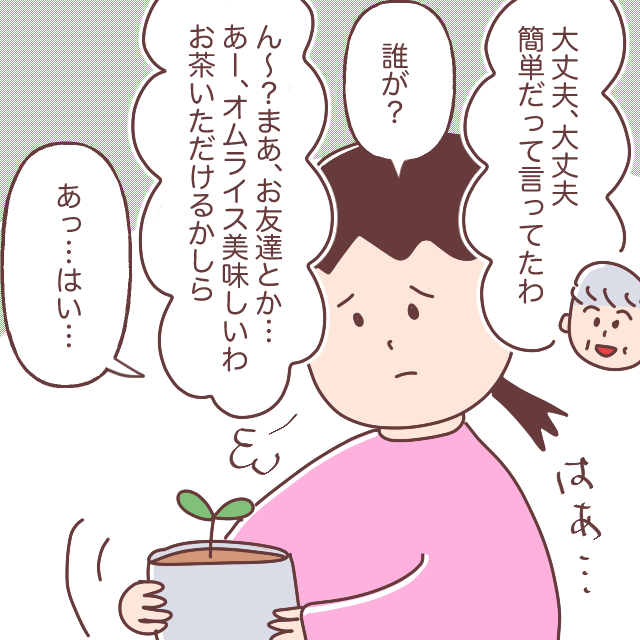 文句ばかり言っていたくせに、私が伝えた「ブランドたまごで作ったオムライス(うそ)」を信じて嬉しそうに「美味しい」と完食した義母。一息つくと、「そうそう、忘れてた。今日はこのお花の苗を持ってきたの~」と小さな芽が出たばかりの鉢植えを見せてきました。