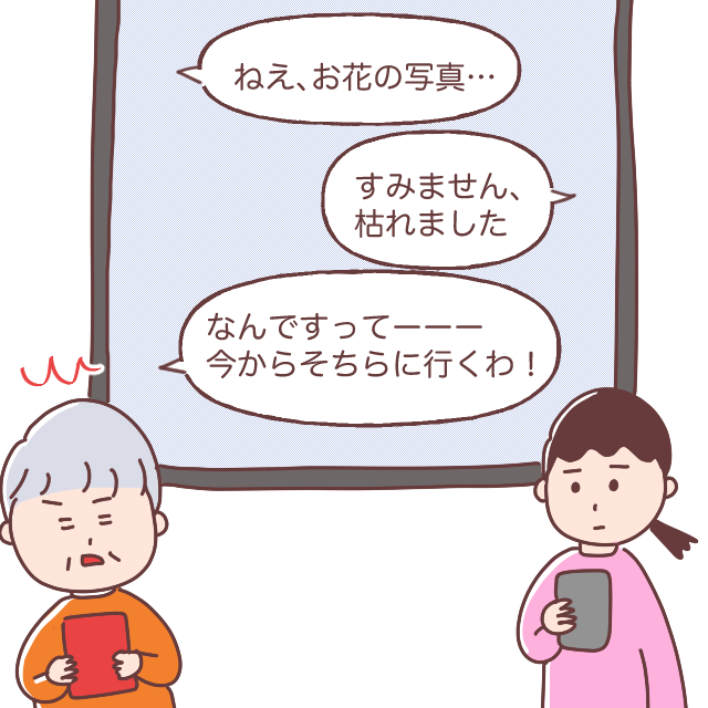 翌日、いつものように義母から『ねぇ、お花の写真』とメッセージが来たので『すみません、枯れました』と送り返しました。すると『なんですってーーー今からそちらに行くわ!』とかなり慌てた様子です。なにかあるな、と私は思いました。