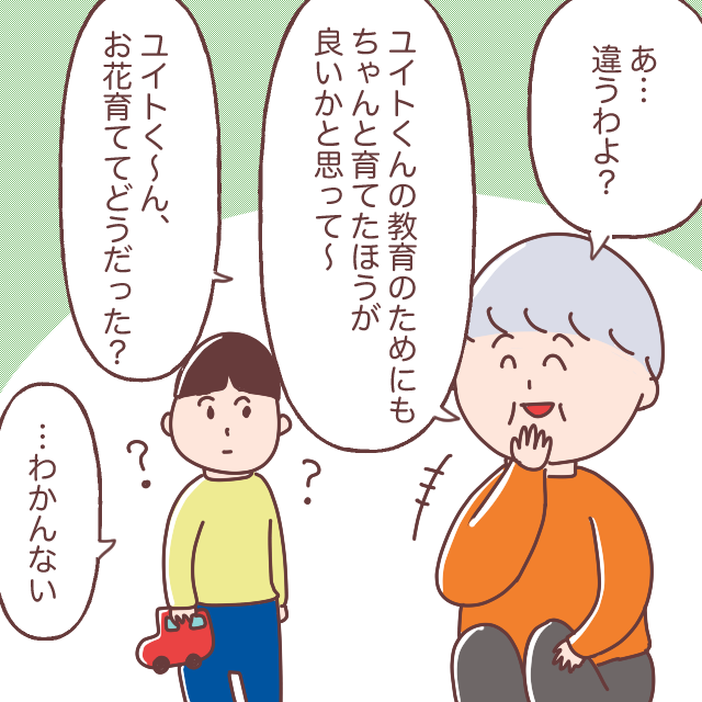 「あ・・・違うわよ?」と急に笑顔になって「ユイトくんの教育のためにもちゃんと育てた方が良いかと思って~。」と孫想いのおばあちゃんを演じ始めました。「ユイトく~ん、お花育ててどうだった?」とユイトに声をかけますが、ユイトは不思議そうに「わかんない。」と答えました。