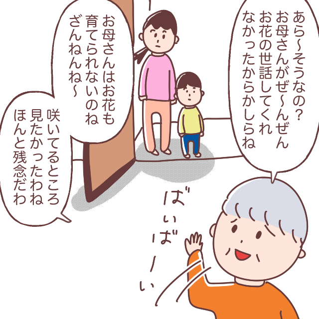 嘘がバレたし、用もなくなった義母は「お母さんがぜ~んぜんお花の世話してくれなかったからかしらね。」「お母さんはお花も育てられないのね。残念ね~。咲いてるところ見たかったわね。ほんと残念だわ。」と、私に世話を押し付けていたことは棚に上げ、さんざん嫌味を言いながら帰っていきました。