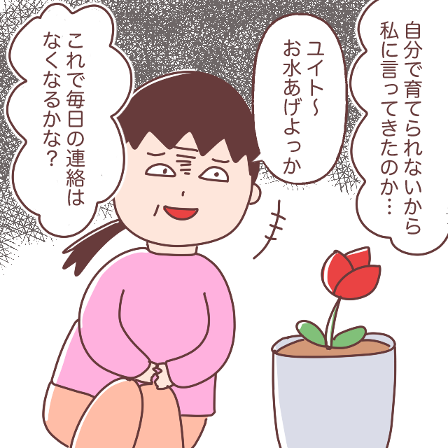 義母が帰ったあと、私は綺麗に咲いたお花を眺めていました。「ユイト~、お水あげよっか。」お花が枯れたというのは嘘。ユイトと一緒に大切に育てた苗は、綺麗な花を咲かせています。少し面倒だったけれど、咲いたお花は綺麗だし、毎日の連絡は無くなるし。めでたしめでたし。