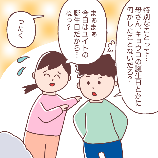 すると、いちいち私に突っかかる義母を見て夫が、「特別なことって・・母さん、キョウコの誕生日とかに何かしたことないだろ?」と義母に突っかかると、「まぁまぁ、今日はユイトの誕生日だから・・ねっ?」私が夫をなだめると、「ったく」と不満そうに夫が呟きました。