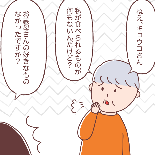 それを見ていた義母が、「ねえ、キョウコさん、私が食べられるものが何もないんだけど?」真顔でそう言われ、「お義母さんの好きなものなかったですか?」私がそうたずねると、