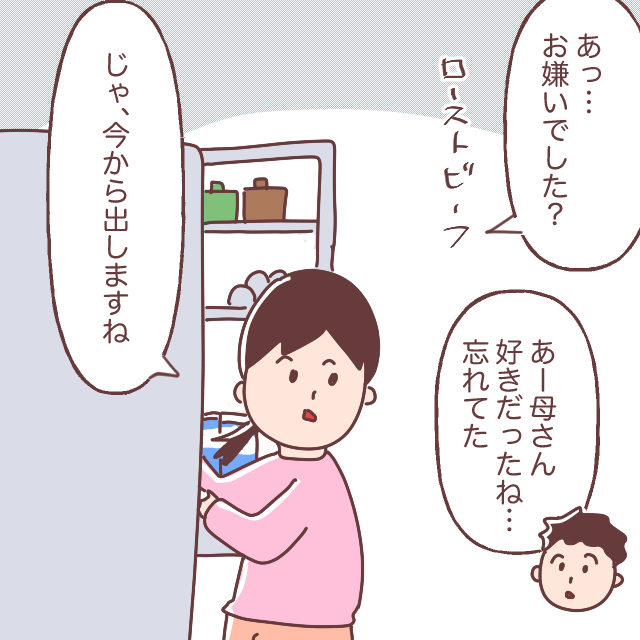 驚く義母の言葉に、「あっ・・お嫌いでした?ローストビーフ。じゃ、今から出しますね」私の言葉を聞いて、「あー母さん好きだったね・・忘れてた」と夫が言うと、