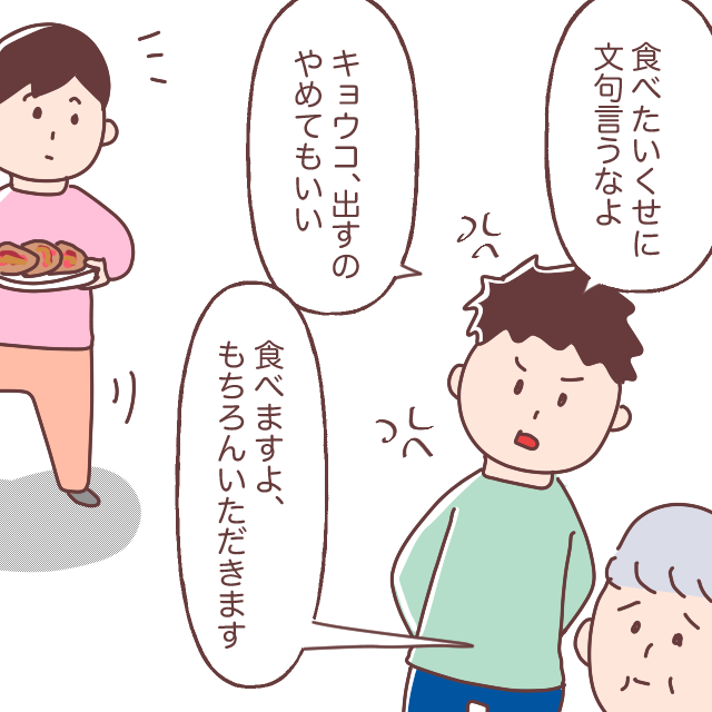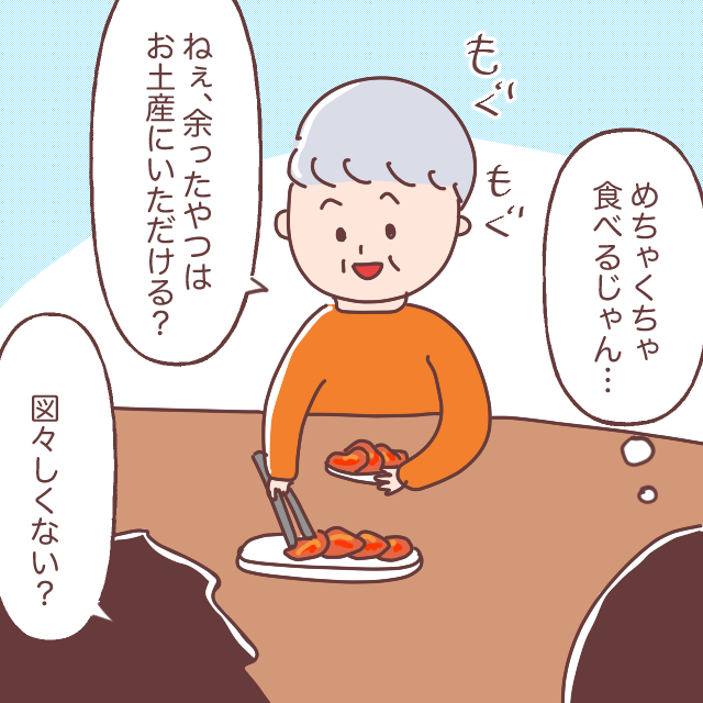 どんどん食べる義母を見て、「めちゃくちゃ食べるじゃん・・」と心の中で呟く私。すると、よほど大好物なのでしょうね、「ねぇ、余ったやつはお土産にいただける?」と言われ、図々しいにもほどがあると思うのでした。