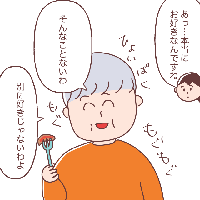 そしてもぐもぐ食べる義母を見て、「あっ・・本当にお好きなんですね」というと、「そんなことないわ。別に好きじゃないわよと言いながらスゴイ勢いで食べ続ける義母の言葉の説得力のなさ。