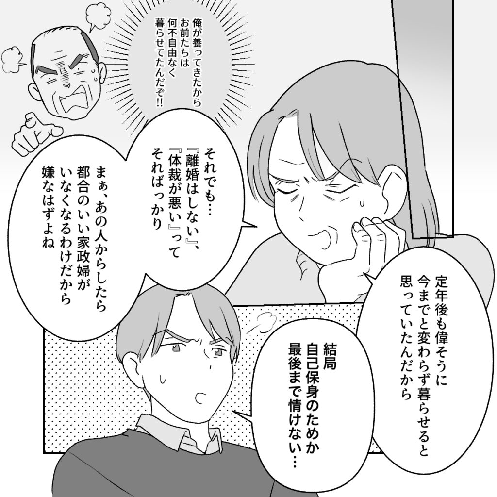 「俺が養ってきたからお前たちは何不自由なく暮らせてたんだぞ!」と怒り出した義父の顔を思い出して不機嫌になりながら、「それでも・・『離婚はしない』、『体裁が悪い』ってそればっかり。まぁ、あの人からしたら都合のいい家政婦がいなくなるわけだから嫌なはずよね、定年後も偉そうに、今までと変わらず暮らせると思っていたんだから」と言う義母に、「結局自己保身のためか、最後まで情けない・・」とコウも呆れたように言いました。